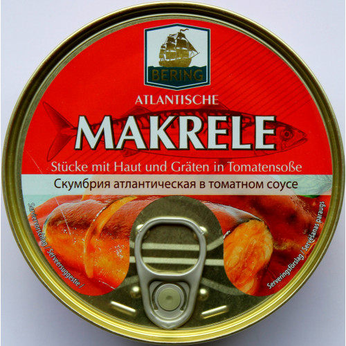 Ingredienser: makrill (Scomber scombrus) 65%, tomatsås (vatten, tomatpuré tripelkoncentrerad, socker, salt, rapsolja,surhetsreglerande medel ättiksyra, kryddor).