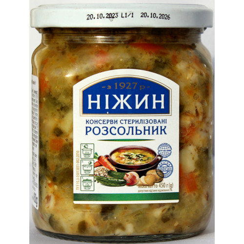 Ingredienser: ättiksgurka 35% (gurkor, bordssalt); potatis 30%, lök 12%, morot 9,8%, pärlgryn 8,2%, vegetabilisk olja: solrosolja, salt, vitlök, torkad paprika, dextros, svartpeppar extrakt, Lök extrakt, vitlöksextrakt, paprikaextrakt , mejram, dill, persilja, basilika, timjan, oregano, lagerblad.