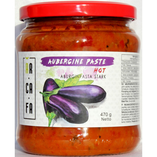 Ingredienser: Aubergine, röd-grön paprika, lök, persilja, mald svartpeppar, lagerblad, salt, solrosolja, tomatpuré, chilipeppar, mald röd peppar.