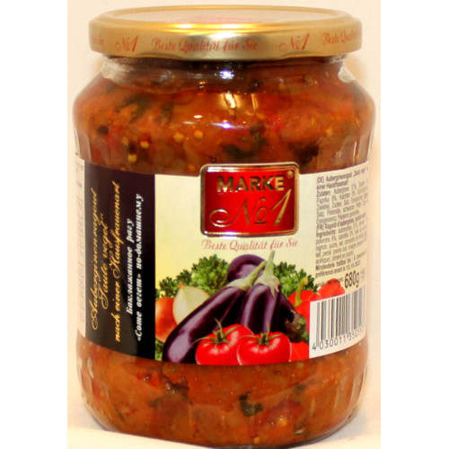 Ingredienser: Aubergine 51%, tomater 10%, paprika 8%, morötter 8%, solrosolja, lök, socker, salt, tomatpuré, selleri, salt, persilja, svartpeppar, ättika från vinägeressens, malen paprika.