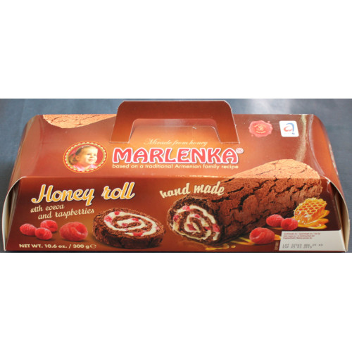 Honungsrulltårta MARLENKA med kakao och hallon 300g. Bakat efter ett gammalt armeniskt familjerecept - utan konserveringsmedel och konstgjorda färgämnen.