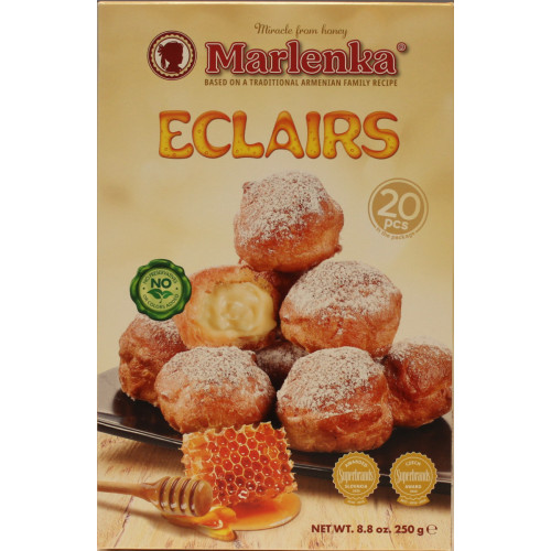 Petit-chou eclairs med gräddfyllning 70% 250g. Bakat efter ett gammalt armeniskt familjerecept - utan konserveringsmedel och konstgjorda färgämnen.