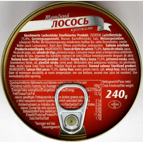 Ingredienser: laxfilé bitar 75%, kornmjöl, vatten, potatisstärkelse, salt, vetekli, svartpeppar.