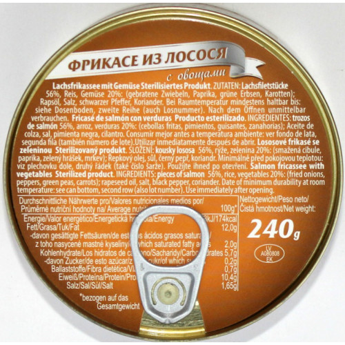 Ingredienser: lax bitar 56%, ris, grönsaker (stekt lök, paprika, gröna ärtor, morötter), rapsolja, salt, svart peppar, koriander.