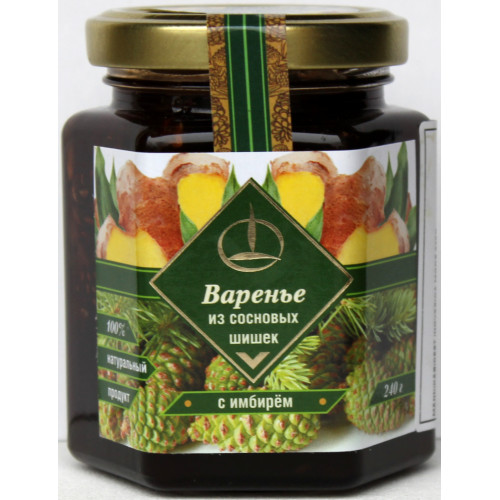 Sylt av grankottar med ingefära, utan färgämnen, doftämnen, steriliserad produkt.