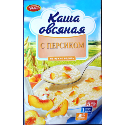 Ingredienser: havregryn 70%, socker, torkade persikor 2%, salt, aromberedning (aromer, maltodextrin, konstituens: triacetin, stabilisator: gummi arabicum).