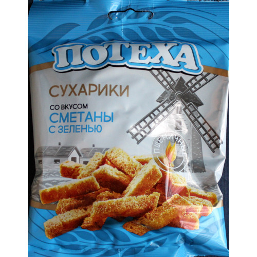 Ingredienser: Vetebröd (vetemjöl, vatten, rågmjöl, bordssalt, jäst), solrosolja, smaksättningsblandning (bordssalt, vetemjöl, glukos torkat, socker, lökpulver, smakförstärkare: E621, E627, E631; örter, surhetsreglerare: E270, E327; smaker, palmolja, färg E100 , separationsmedel E551), salt.