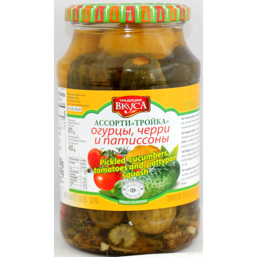 Ingredienser: tomater 30%, gurka 10%, squash 10%, vatten, vinäger, socker, dill, vitlök, lök, röd peppar, salt,