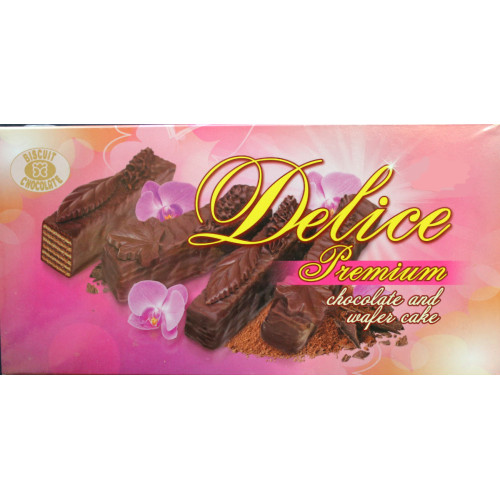 Våffeltårta "Delis" i chokladglasyr (28%), dekorerad med choklad (6,7%) i lönnlövform.